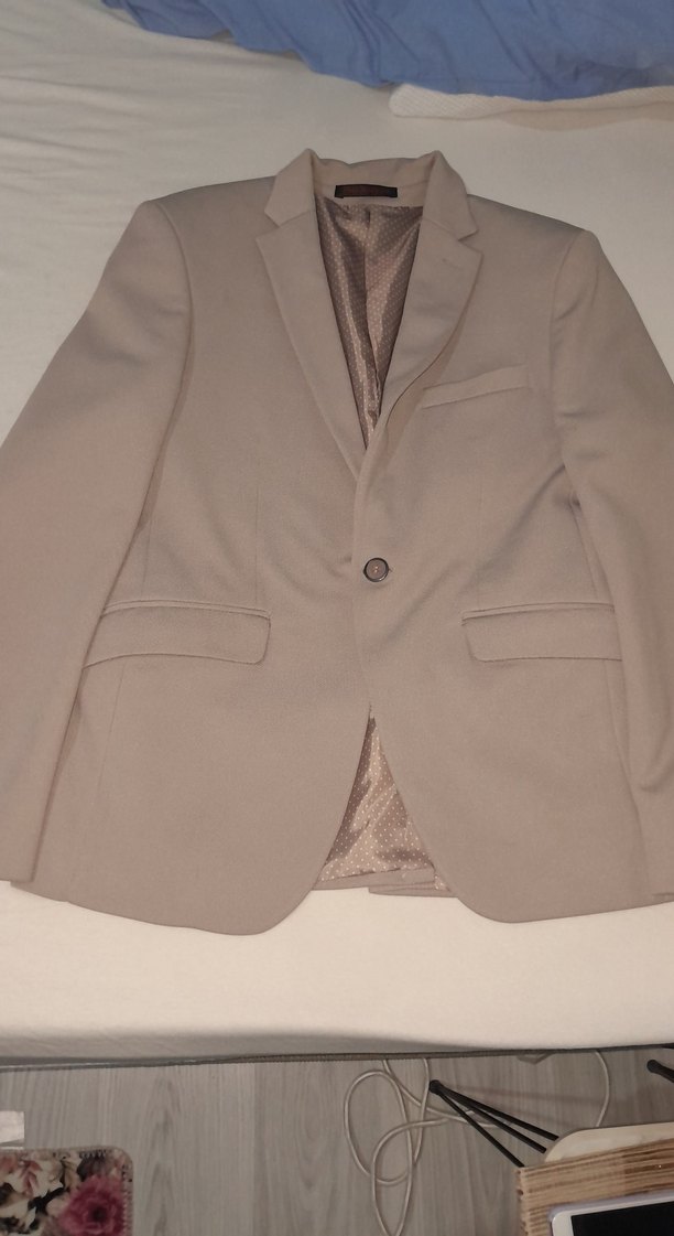 Bej renkli erkek takım elbise ceketi, notch yakalı ve düğmeli ön kısmı ile dikkat çeker. Normal boy ve uzun kolludur, klasik ve sokak stili arasında bir görünüm sunar. Desensiz ve şık tasarıma sahiptir.