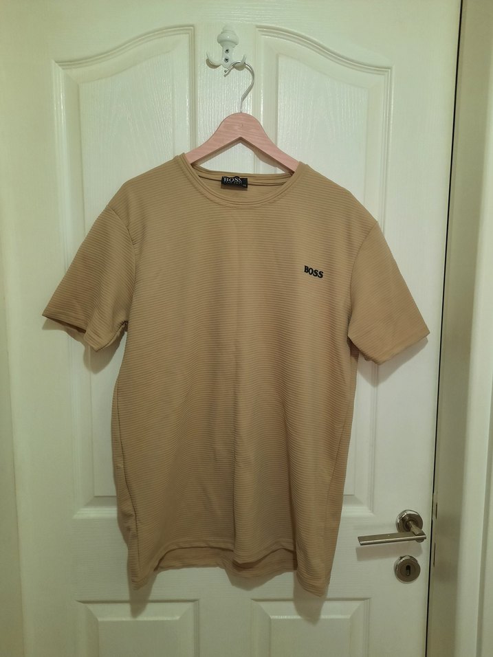 Bej renkli, kısa kollu, bisiklet yaka ve loose fit kesime sahip erkek keten tişört. Düz ve küçük 'BOSS' logosu ile günlük rahat kullanıma uygun. Emitasyon üründür 1 kez giyildi boy 75 cm iki kol arası 56 cm
