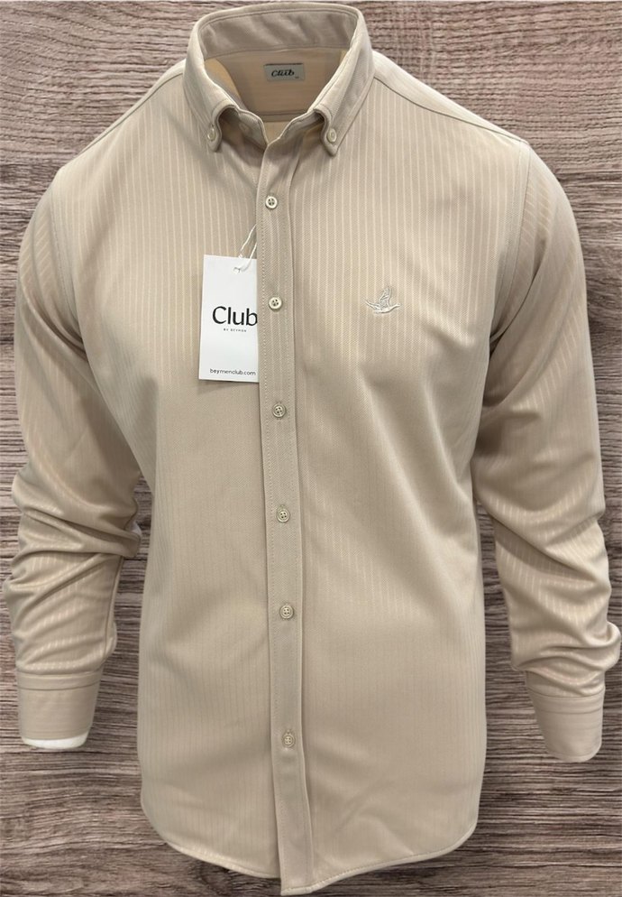 Bej renkli, uzun kollu, düğmeli ve regular fit erkek gömleği. Sentetik kumaştan, ofis ve günlük kullanım için uygun, 'Club' etiketi bulunur.