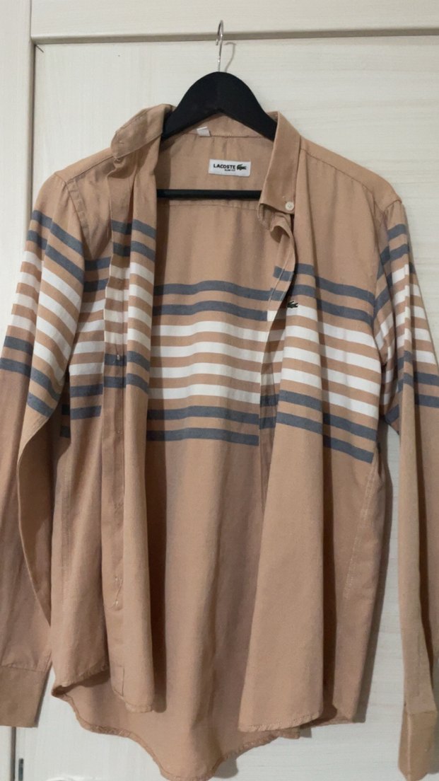 Bej renkli, uzun kollu, düğmeli ve yakalı erkek gömleği. Rahat kesim ve sentetik kumaş, çizgili desene sahip, günlük sokak tarzı için uygun.
