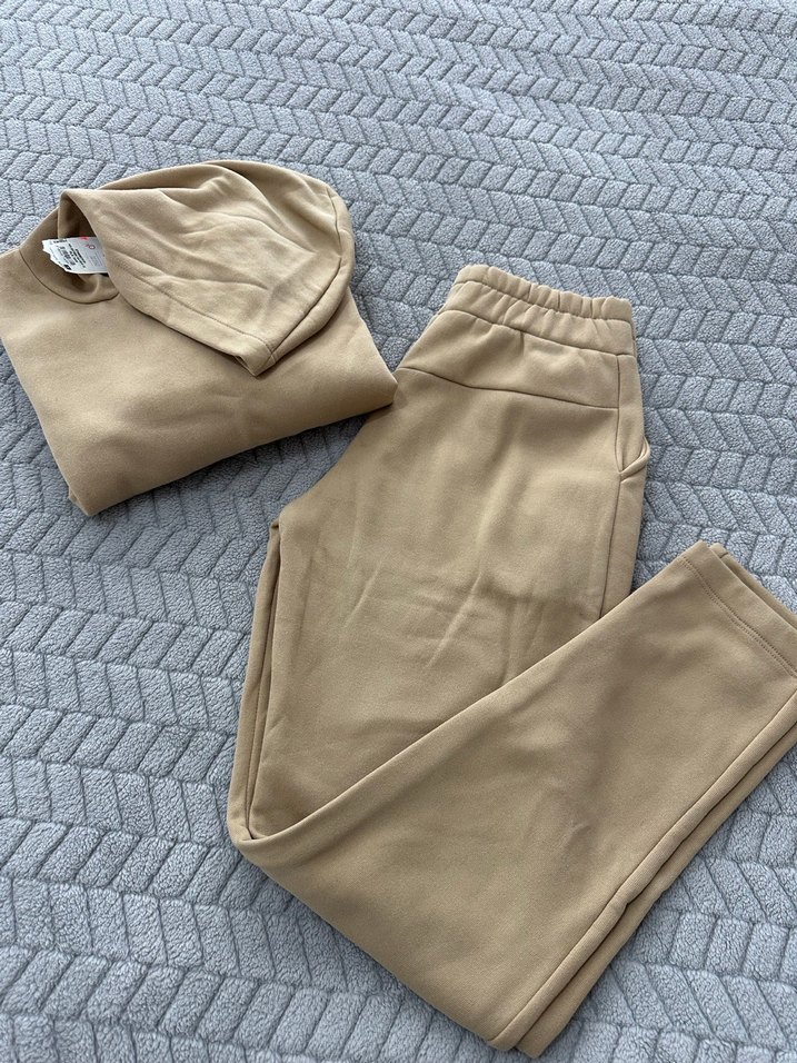 Yumuşak ve sıcak kumaştan, rahat kesim bej eşofman takımı Günlük kullanıma uygun, desen içermeyen, zahmetsiz şıklık sunar.