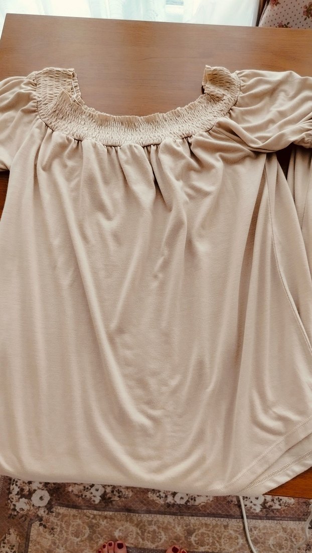Bej renkli, V yaka, uzun kollu. Midi boyda ve yumuşak dokulu.