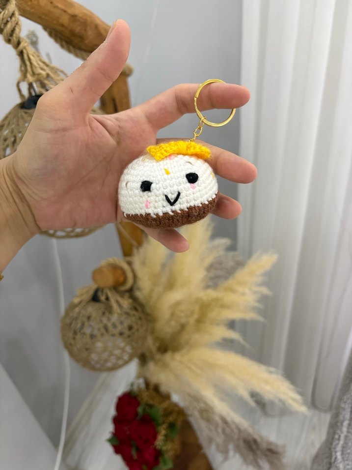 Bej renkte, şişkin yapıda, sevimli gülen yüz tasarımlı, rahat ve bohem tarzda anahtarlık. Retro dokunuş için ideal.