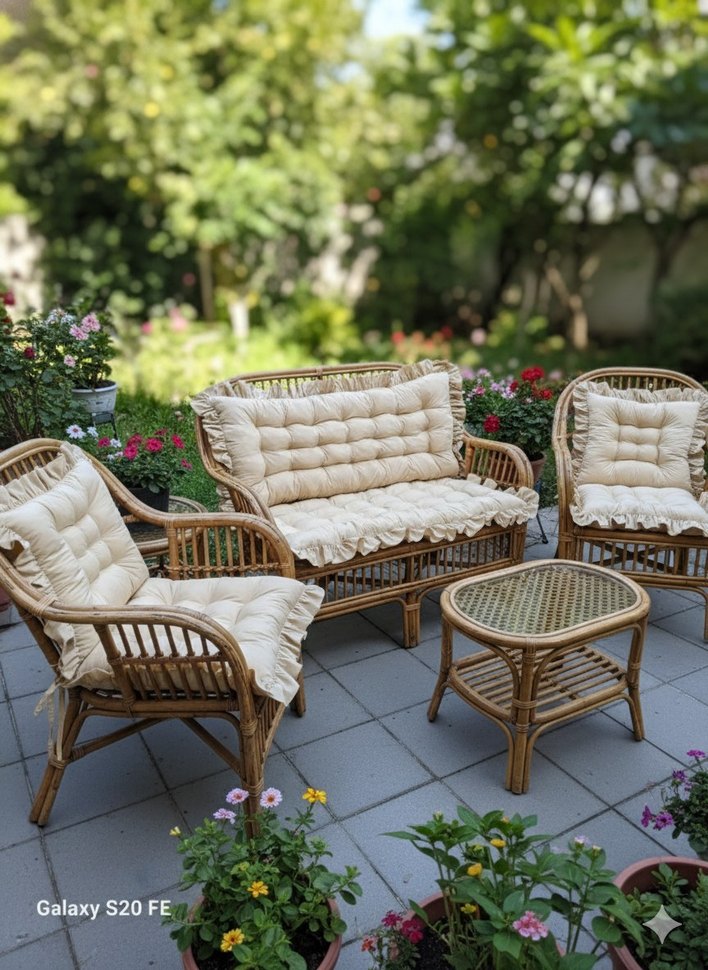 Bej renkli, etnik desenli ve bohem tarzda, hafif tonlarda minderler. Rattan mobilyalar üzerinde kullanıma uygun.