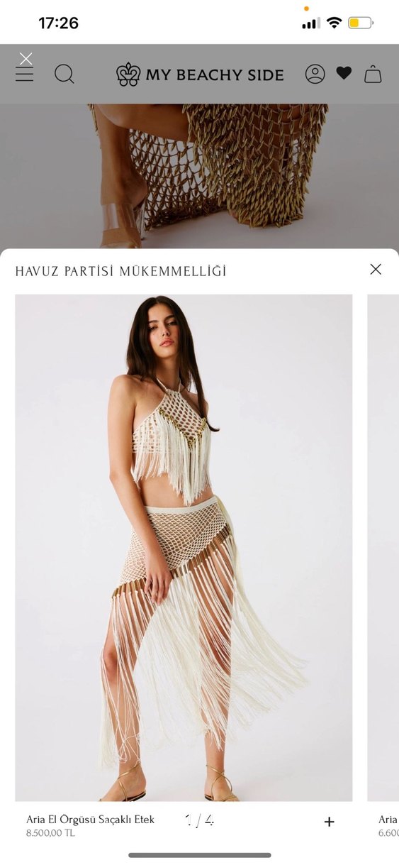 Bej renkte, etnik desenli ve drapeli tasarıma sahip kadın vücut zinciri, parti için uygundur. Hafif, bohem stilde. Optik metin: "HAVUZ PARTISI MUKEMMELLIGI". ✨