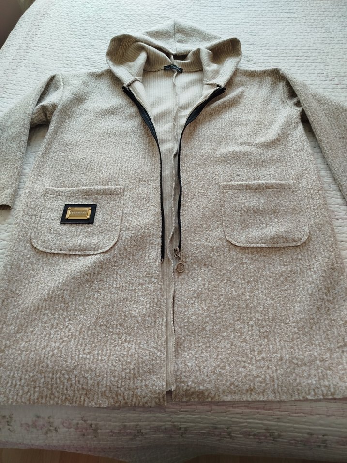 Bej renkli, fermuarlı bayan polar sweatshirt. Uzun kollu, notched lapel yakalı ve bol kesimdir. İki ön cepli, günlük kullanıma uygun.