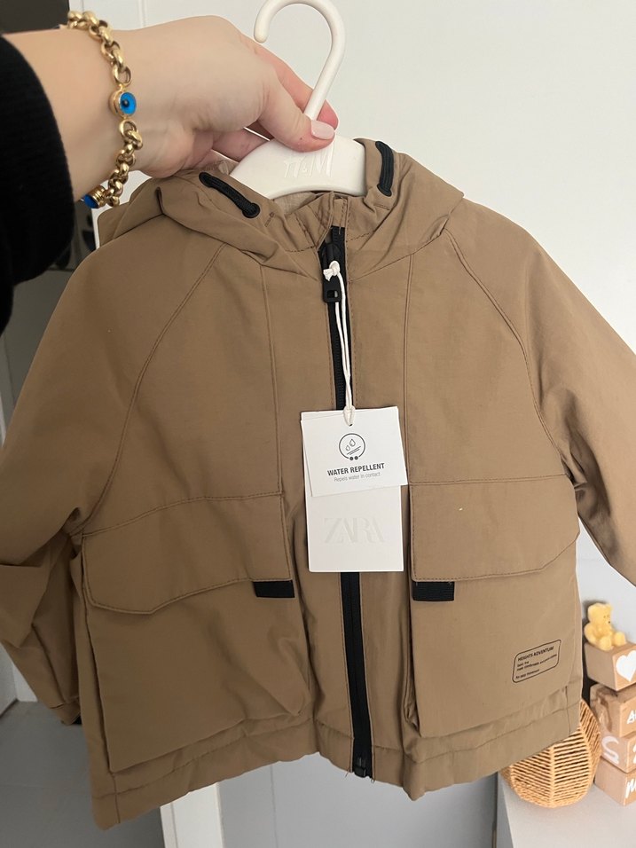 Bej renkli, kapüşonlu ve fermuarlı, erkek çocuklar için sokak stili ceket. Yumuşak ve sıcak kumaştan, su itici özelliğe sahip ve baskılı detaylar içerir.