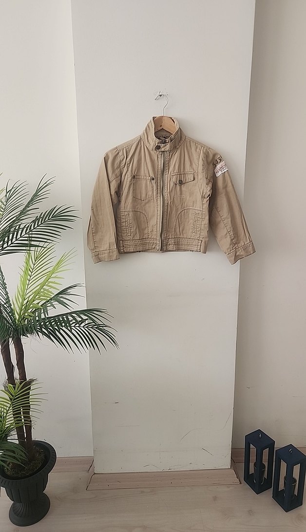 Bej renkli, keten kumaştan yapılmış, fermuarlı ve kesik yaka detaylı erkek çocuk ceketi. Rahat ve trend sokak stili için uygun. son görselde sol üst omuza yakın hafif bir renk açılması mevcut görselleri inceleyin lütfen