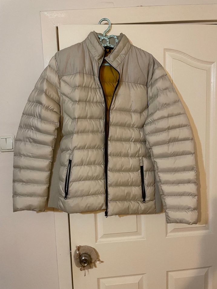 Bej renkli, fermuarlı ön kapamalı, uzun kollu erkek mont. Yumuşak sentetik kumaştan, vücuda oturan kesim ve notalı yaka detayı ile dış mekan kullanımı için uygundur.