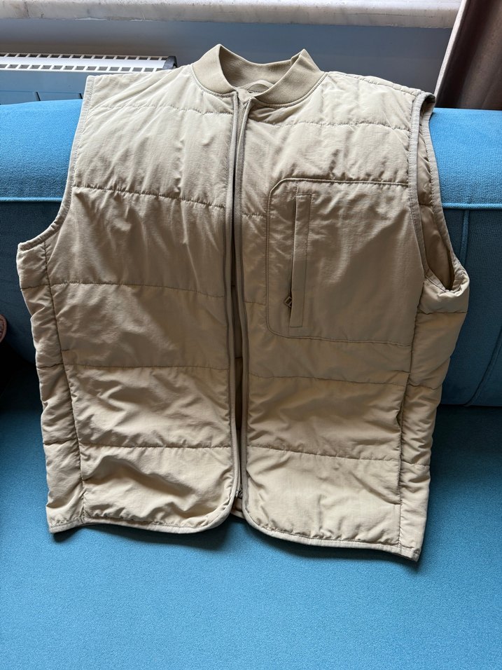 Bej renkte, fermuarlı cep ve yakalı, sentetik kumaştan yapılmış erkek yelek