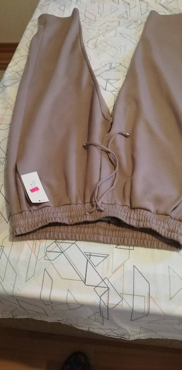 Bej renk, fermuarlı cepli, bağcıklı bel detaylı, hafif sentetik kumaştan eşofman altı. Rahat ve günlük kullanıma uygun.