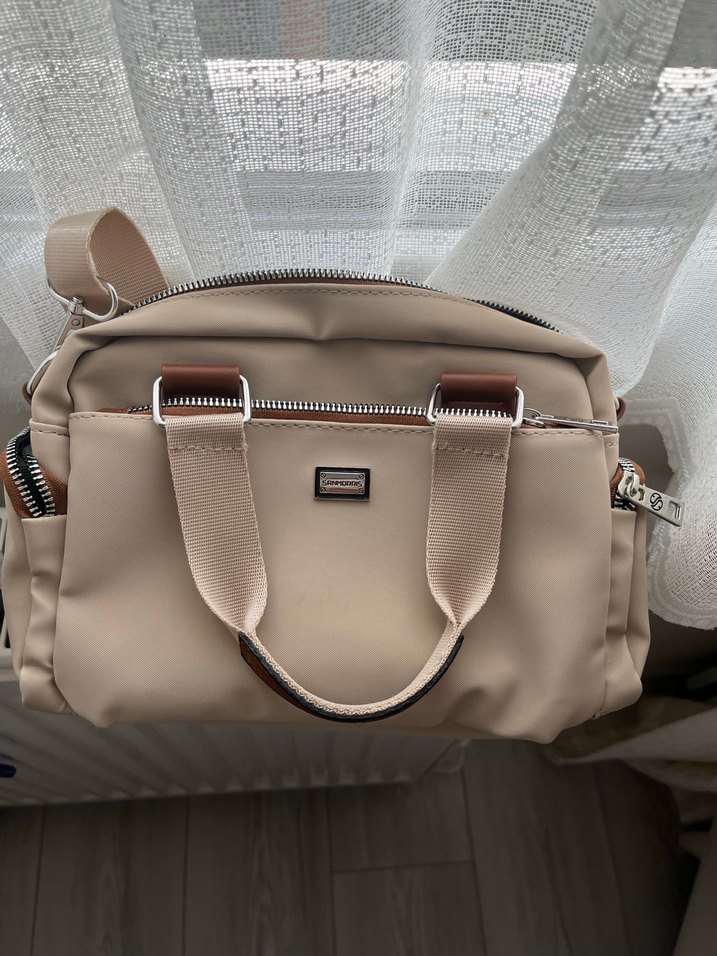 Bej renkte, fermuarlı kapamalı, sentetik kumaştan kadın çantası. Minimalist ve sokak modası tarzında, günlük kullanıma uygun. Sağlam saplara ve desensiz yüzeye sahip. Hiç kullanılmamıştır fiyatta yardımcı olurum