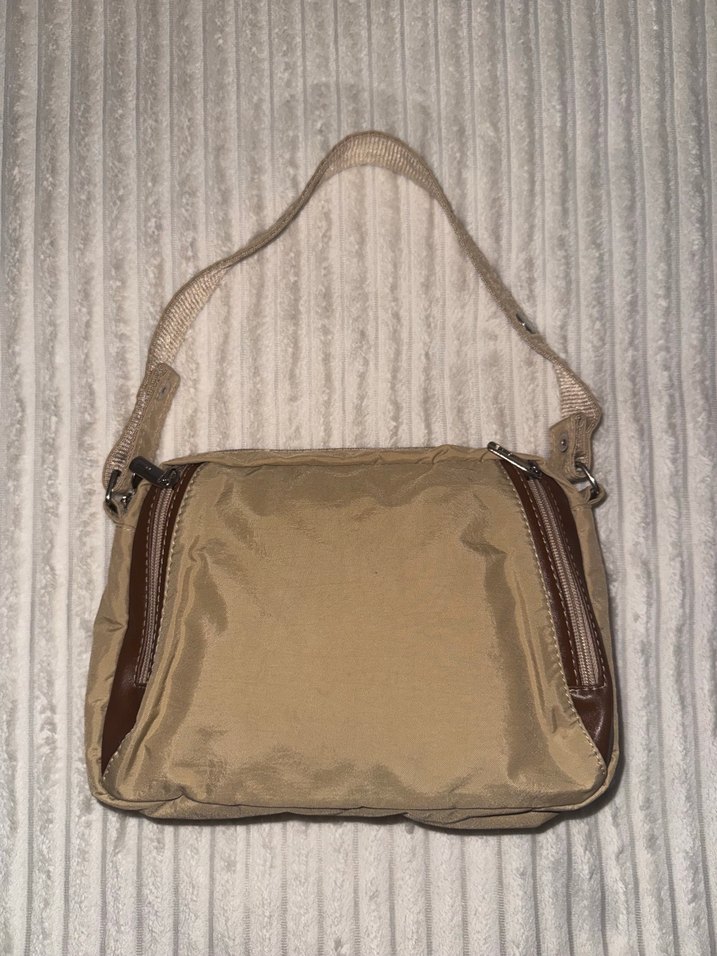 Parlak görünümlü, fermuarlı bej kadın çantası. Minimalist tasarımı ve sentetik kumaşıyla günlük sokak stiline uygundur.