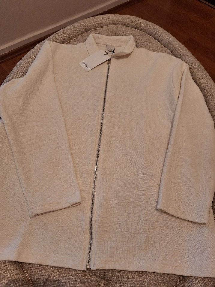 Bej renkte, fermuarlı kadın midi ceket. Notch yakalı, uzun kollu ve rahat kesimdir. Yumuşak, konforlu kumaştan üretilmiştir.