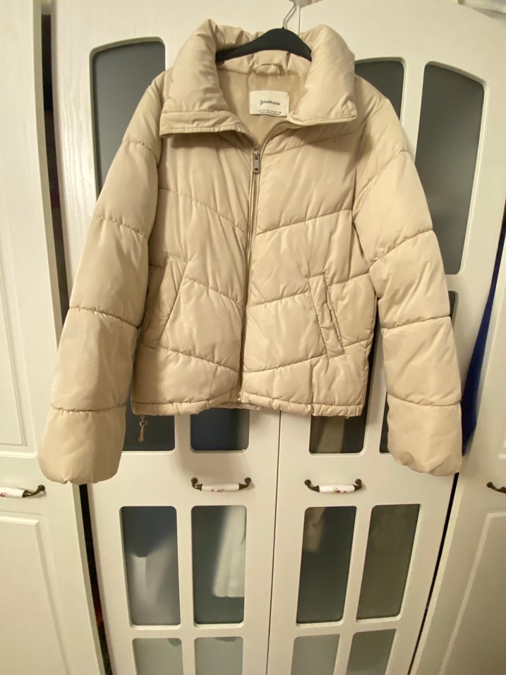 Bej fermuarlı kadın mont, uzun kollu ve kesimli yakaya sahip. Yumuşak sentetik kumaştan yapılmış, günlük rahat kullanım için uygun. Ufak ufak lekeleri var kuru temizlemeyle hallolur diye düşünüyorum.