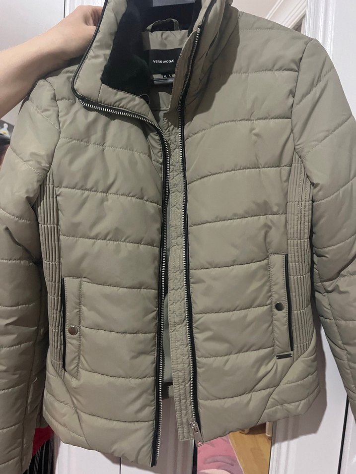 Bej renkte, fermuarlı ve kapaklı yakalı kadın mont. Uzun kollu, normal boyda ve rahat sentetik kumaştan yapılmıştır.