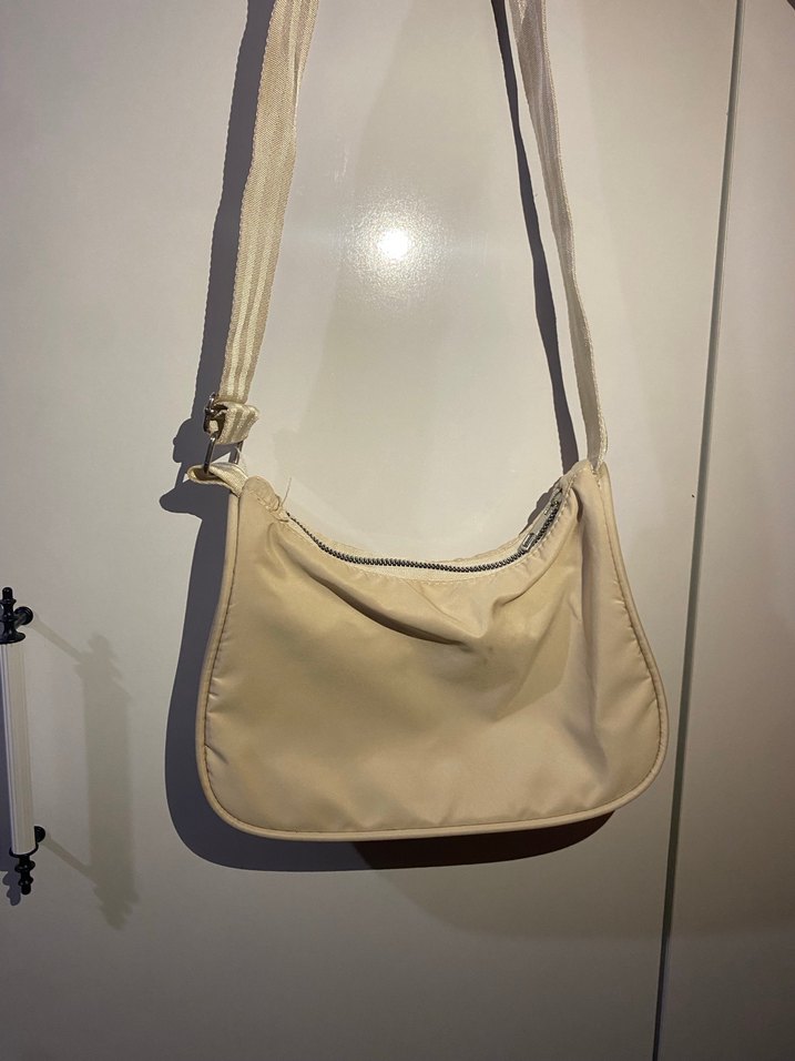 Bej renkli, fermuarlı kadın omuz çantasıdır. Sentetik kumaştan yapılmış, minimalist ve sade tasarıma sahiptir. Günlük kullanıma ve sokak stiline uygundur.