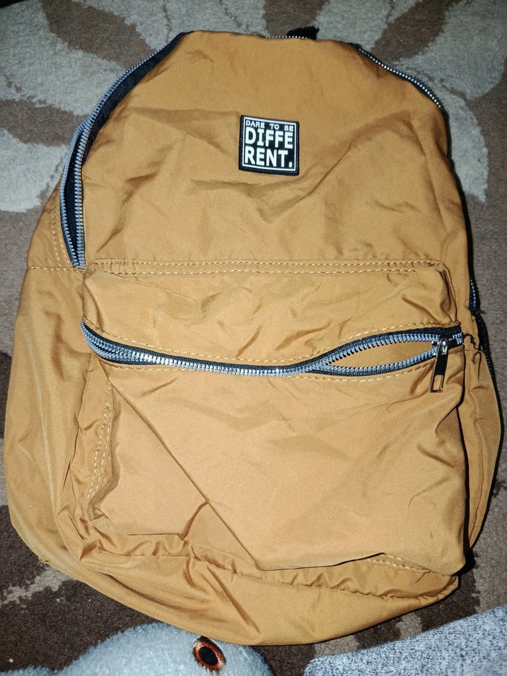 Bej renkli, parlak sentetik kumaş sırt çantası, fermuarlı bölmelere sahip sade sokak tarzında tasarlanmıştır. Önünde 'RENT., DIFFE' yazısı bulunur.