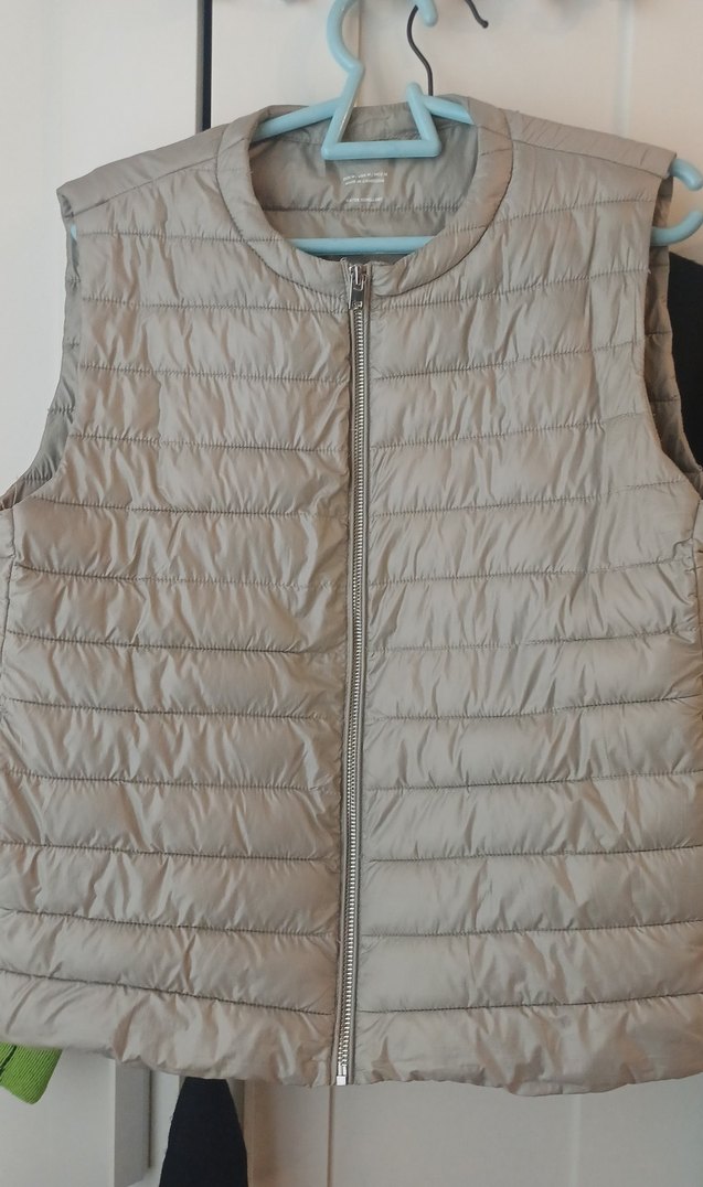 Bej renkli, fermuarlı, kolsuz yelek. Yuvarlak yaka ve rahat kalıpla günlük sokak stiline uygun.