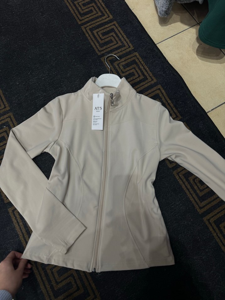 Fermuarlı ve uzun kollu, yüksek yakalı bej renkli kadın spor ceket. Düz desensiz, normal midi boyda ve sentetik kumaştan üretilmiştir. Bedenler mevcuttur