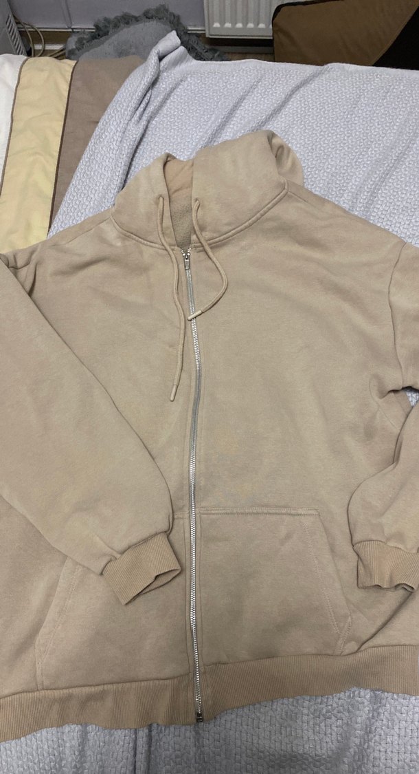 Bej renkli, fermuarlı, uzun kollu ve yuvarlak yakalı kadın sweatshirtü. Yumuşak ve sıcak kumaştan, rahat kesimli, sokak stili için uygun.