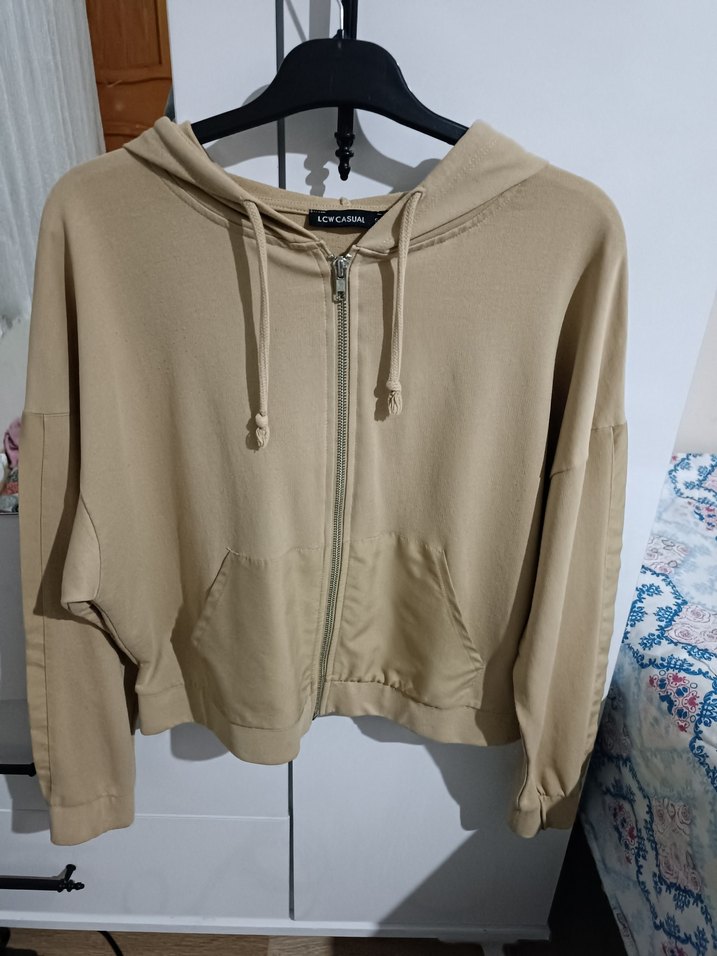 Bej renk, fermuarlı ve uzun kollu kadın sweatshirtü, rahat kesim ve yuvarlak yakaya sahiptir. Yumuşak ve sıcak kumaştan üretilmiştir.