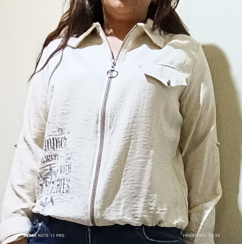 Bej keten gömlek, yakalı ve uzun kollu, ön fermuarlı ve bol kesimdir. Baskılı detaylara sahip, günlük sokak stili için uygun. 46 beden yaziyor bundada 44 bedene kadar uygundur atleti yoktur ister spor ister klasik kombinlenebilir