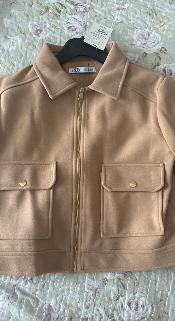 Bej renkli kadın ceketi, fermuarlı, yakası kesik ve kapaklı ceplidir. Uzun kollu, kısa ve rahat kesimdir, yumuşak ve sıcak kumaştan üretilmiştir.