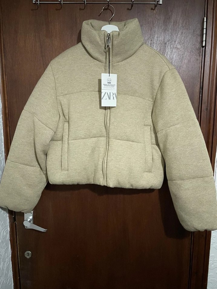 Bej renkte, fermuarlı ve kısa kesim kadın mont. Yüksek yakalı, uzun kollu ve vücuda oturan tasarımıyla rahat bir şıklık sunar.
