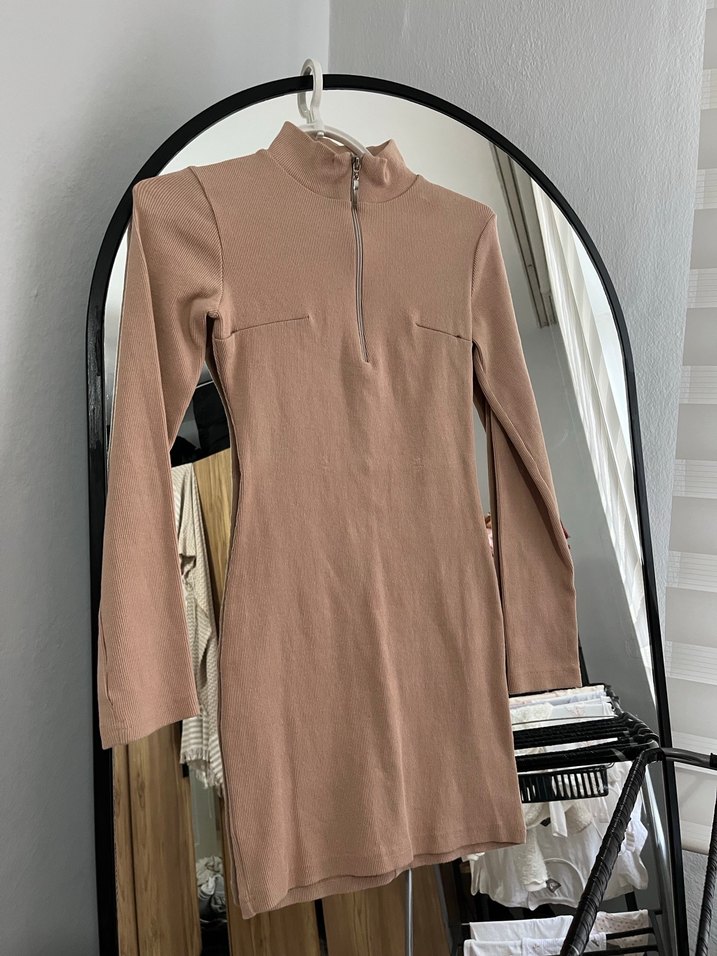 Bej renkli, uzun kollu, yüksek yakalı ve ön fermuarlı midi triko elbise. Pastel tonlarda, yumuşak sentetik kumaştan, günlük rahat tarz için uygun.