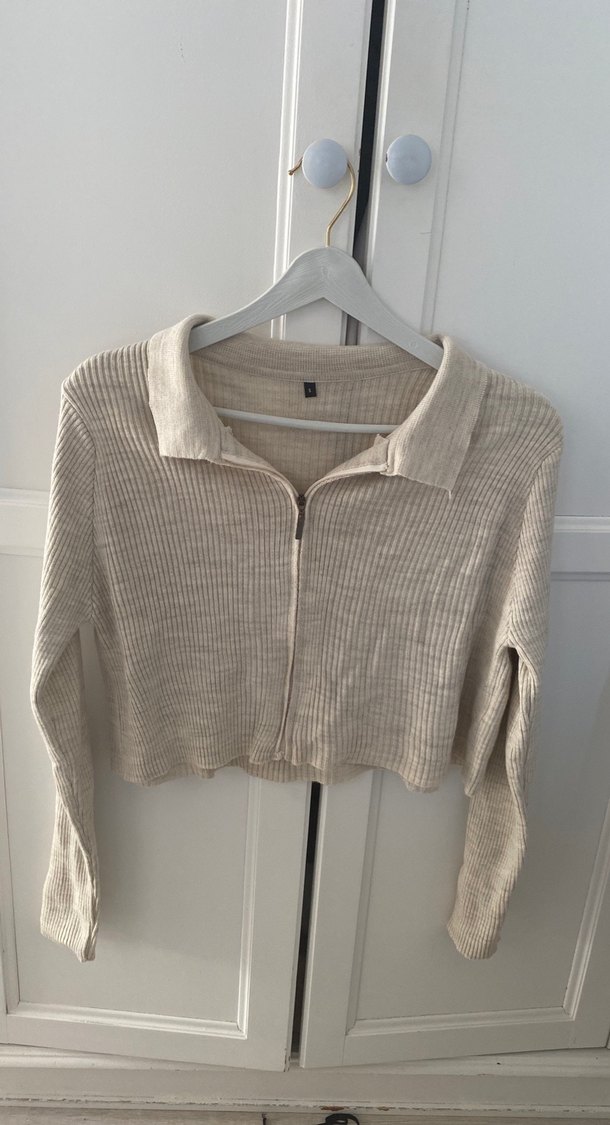 Bej renkli, fermuarlı ve yakalı, yumuşak keten kumaştan yapılmış, rahat ve sokak stili kadın triko kazak. Günlük kullanıma uygundur.