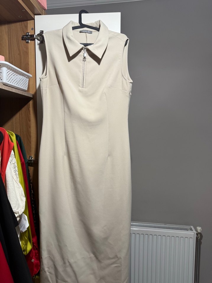 Bej renkli, yakalı ve ön fermuarlı kolsuz uzun elbise. Düz sentetik kumaştan, ofis veya sokak tarzı için uygun, regular 2 defa tek giydim