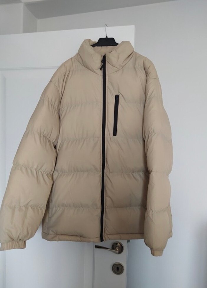 Bej renkte, fermuarlı ve yüksek yakalı erkek mont. Orta uzunlukta, uzun kollu ve yumuşak, sıcak kumaştan üretilmiştir.