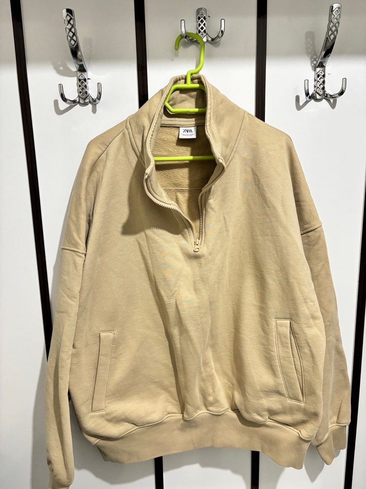 Bej renk, yüksek yakalı fermuarlı, uzun kollu ve bol kesim sweatshirt. Yumuşak ve sıcak kumaştan, günlük rahat kullanıma uygun.