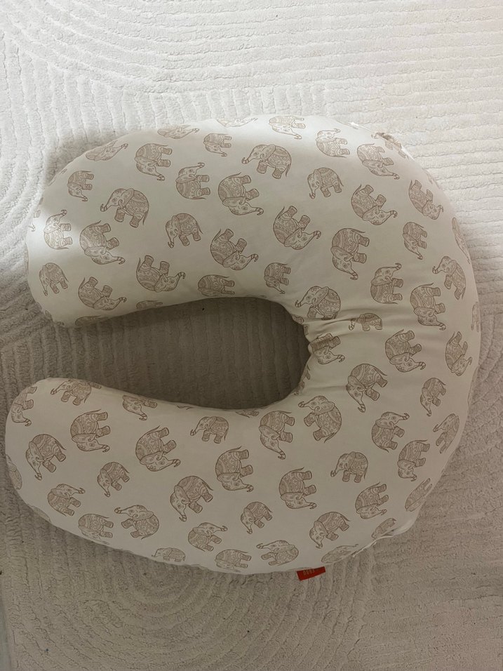 Bej renginde, fil desenli emzirme ve gebelik yastığı, rahat destek sağlar.