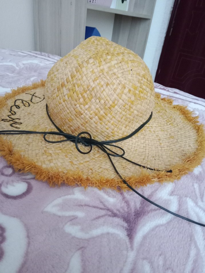Bej renkte, parlak dokulu, fırfırlı kenarlara sahip bohem tarzda kadın hasır şapka, ince siyah bağcık detaylıdır.