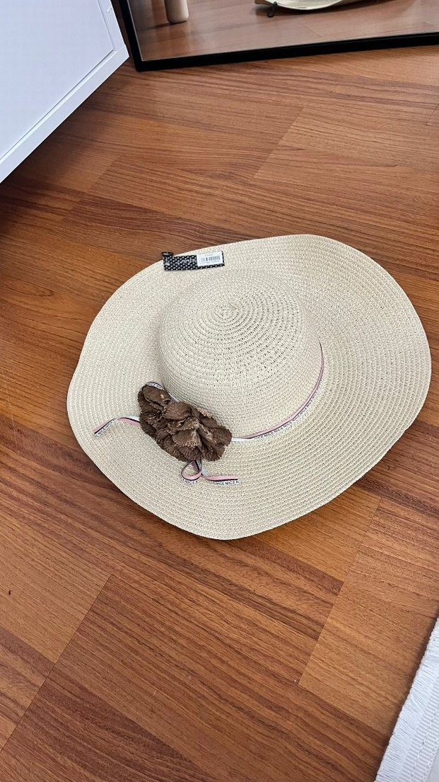 Sentetik kumaştan yapılmış, fırfırlı detaylı bej kadın şapka. Geniş kenarlı ve bohem tarzda, retro veya hippie görünüme uygun.