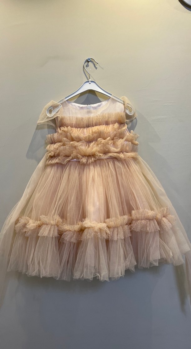 Bej renkli, straplez ve fırfırlı kız çocuk elbisesi, bohem tarzda ve tülden üretilmiştir. 3-4 yaş