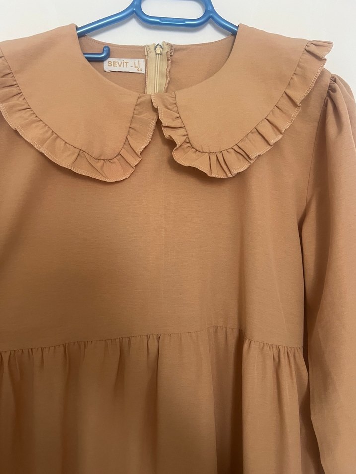 Bej keten kumaştan, fırfırlı yakalı ve uzun kollu, bol kesim hamile elbise. Minimalist ve bohem tarzda.