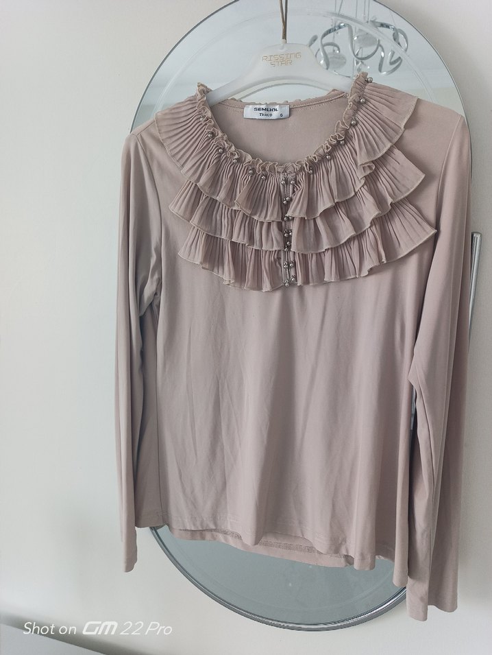 Bej kumaştan, uzun kollu ve yuvarlak yaka, kat kat fırfır detaylı, rahat kesime sahip modern klasik stil bluz. Günlük kullanıma uygundur.