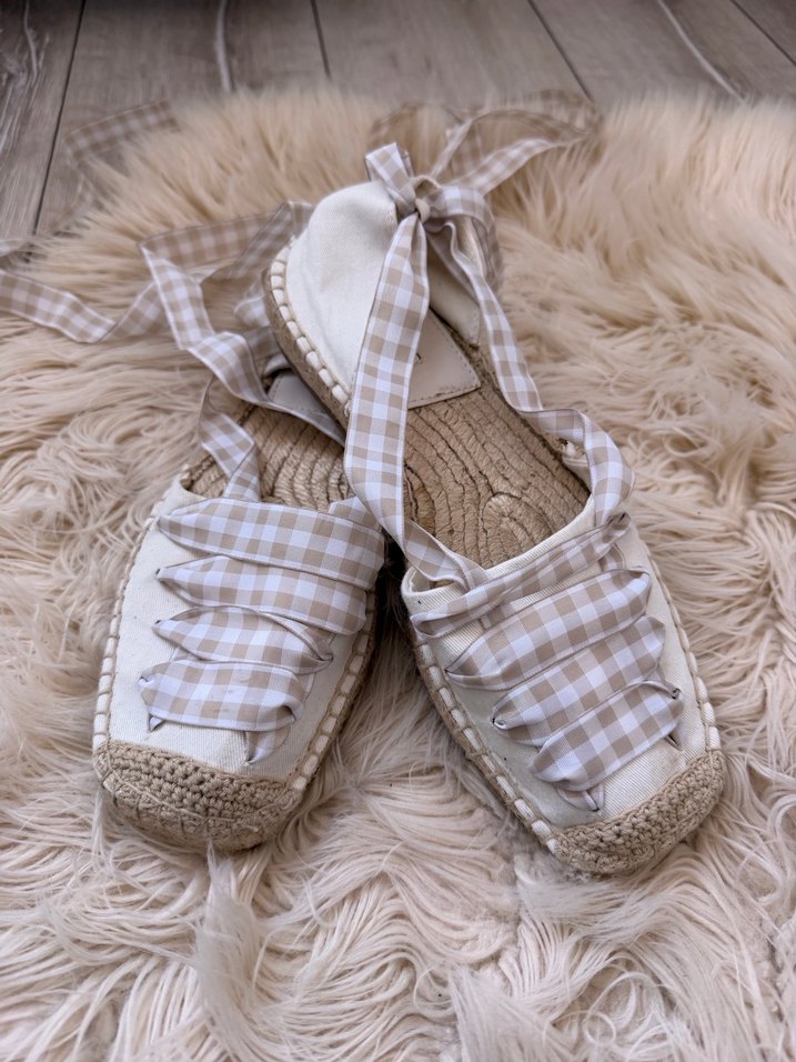 Bej pamuk espadriller, fırfır detaylı ve kareli bağcıklarla. Hasır topuklu ve bohem tarzda, günlük kullanım için uygundur.