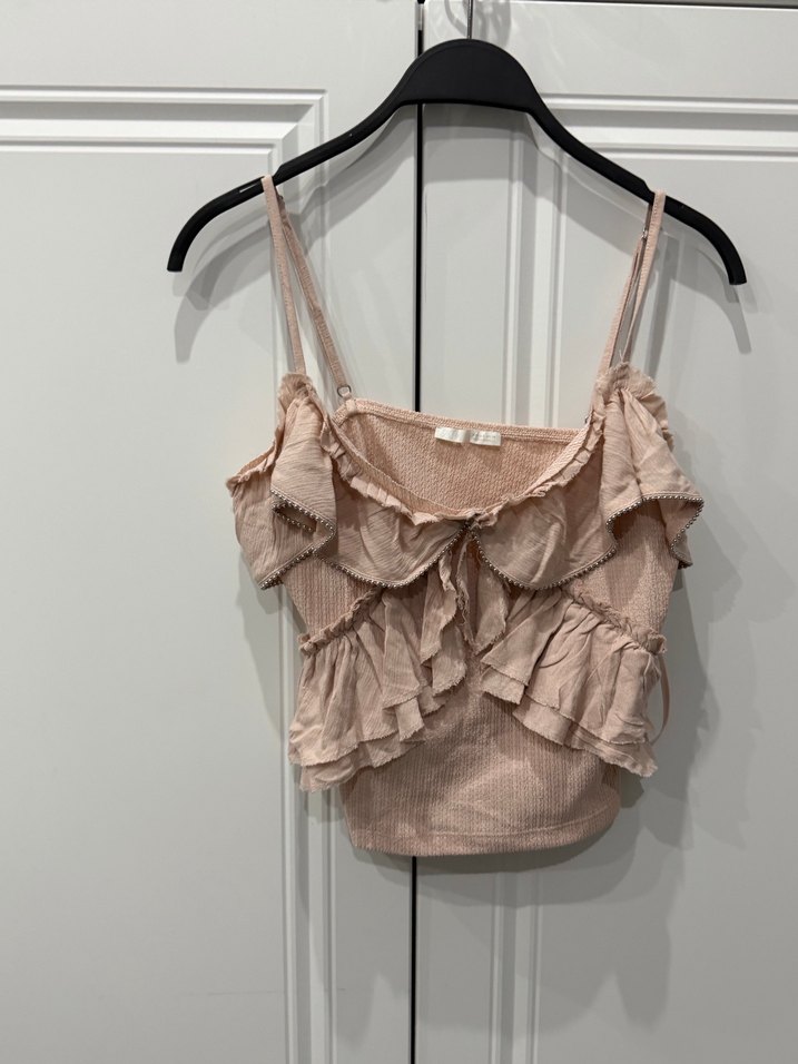 Bej keten kumaştan, fırfırlı ve işlemeli, askılı ve straplez yaka detaylı, bohem tarzda mini boy büstiyer.
