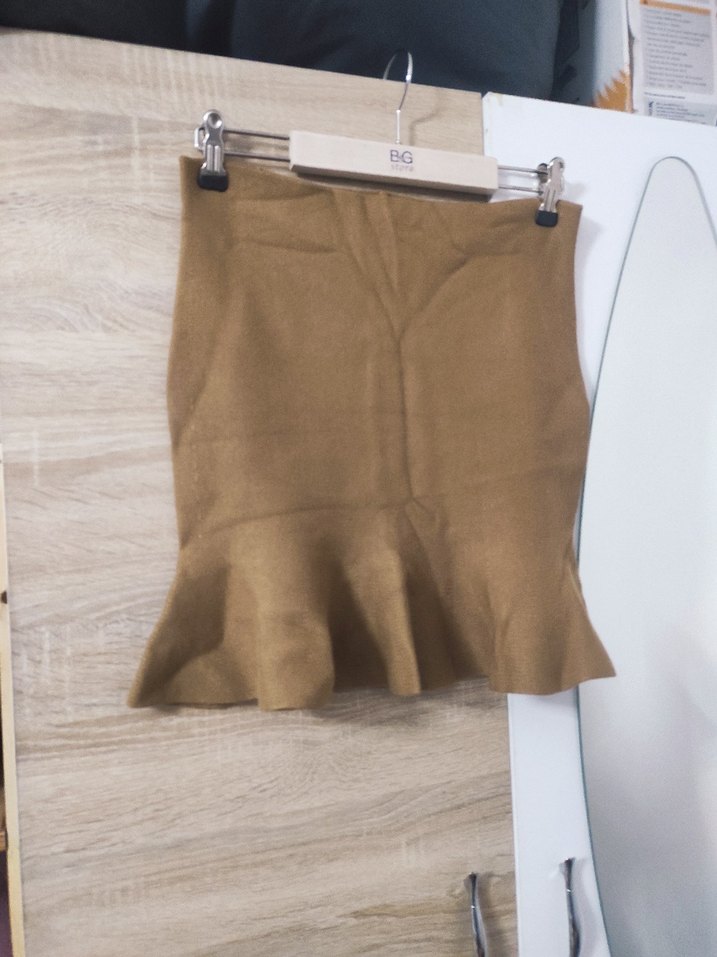 Yumuşak sentetik kumaştan yapılmış, fırfırlı eteğiyle bej renkli, vücuda oturan mini etek. Günlük sokak stili için uygundur.