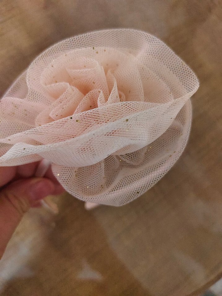 Bej renkte, fırfırlı ve nakışlı detaylara sahip, yumuşak pastel tonlu bohem tarzda çocuk saç tokası.