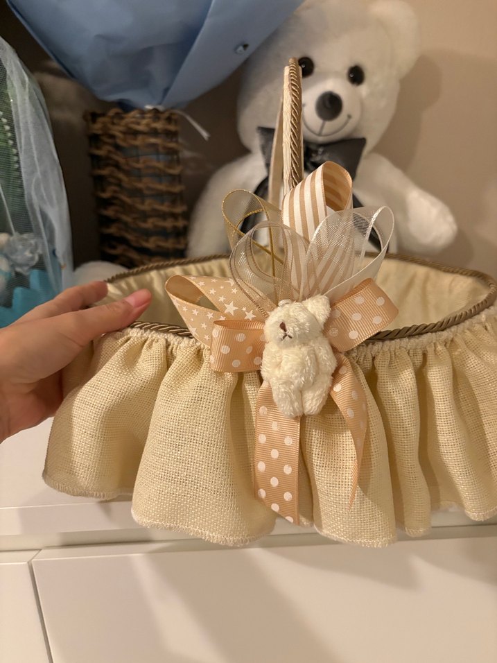 Bej renkli, fırfırlı kenarlara sahip depolama çantası. Pastel kurdeleler ve küçük bir oyuncak ayı ile süslenmiştir. Oğlumun hediyelikleri için kullandım Mevlüt’ün de