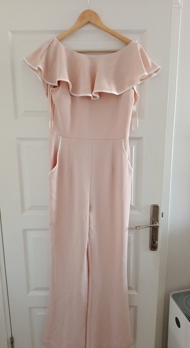 Bej renkli, straplez yaka ve fırfır detaylı uzun tulum. İpek gibi kumaştan, regular fit kesim, klasik ve modern tarzlar için uygun, düğünlerde tercih edilir.