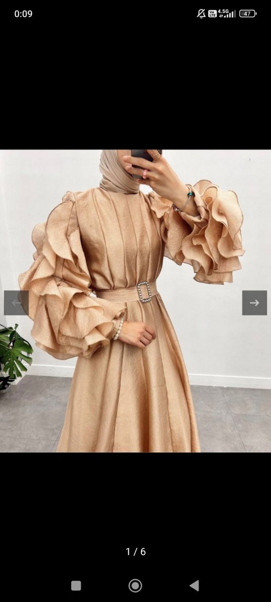 Bej renkli uzun, yüksek yakalı ve fırfırlı uzun kollu elbise. Rahat kesimli ve yumuşak sentetik kumaştan, günlük kullanıma uygun.