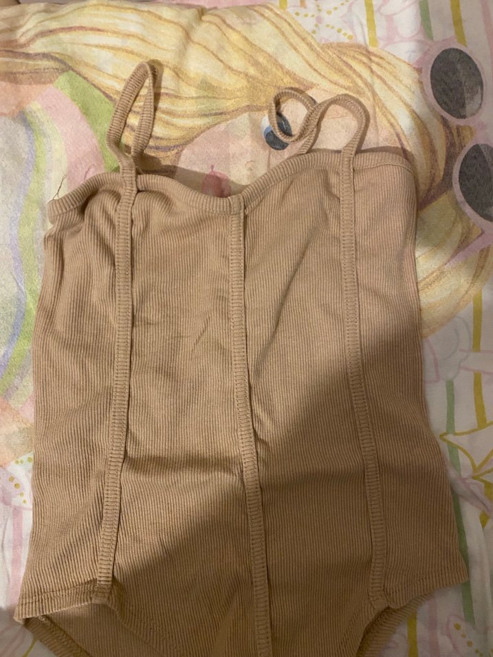 Bej renkli keten askılı body, fit kesim ve straplez yaka detayına sahiptir. Fermuarı bulunur, desen içermeyen rahat bir tasarımdır.
