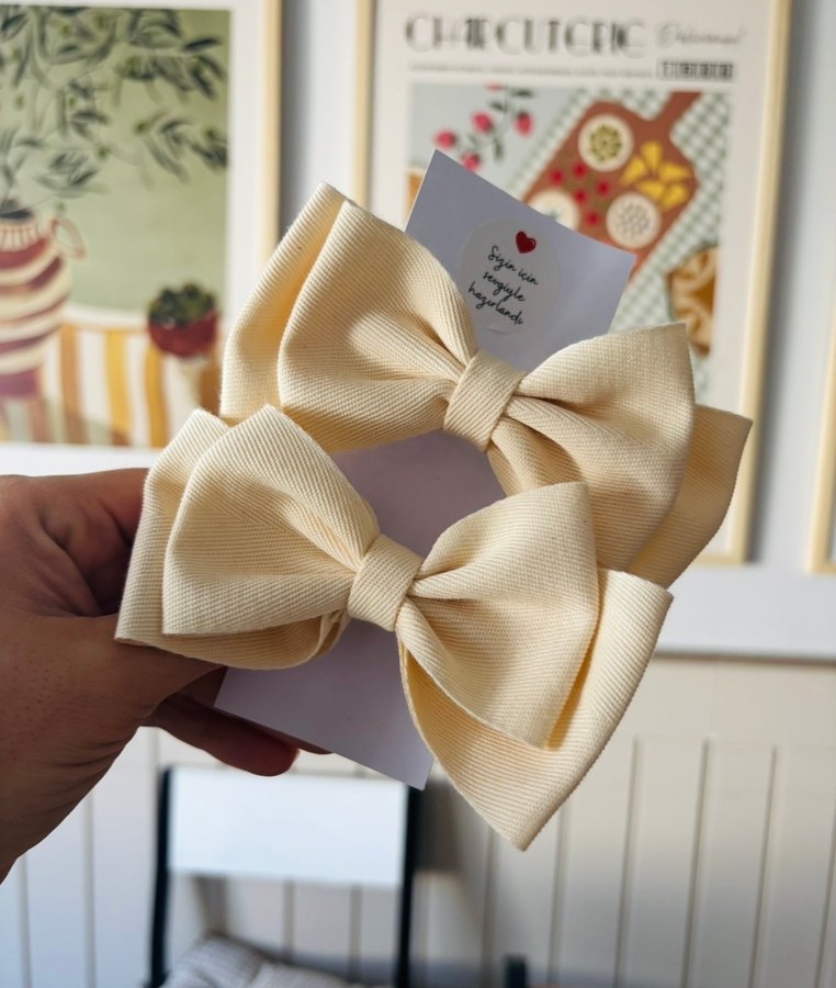 Bej renkli, fiyonk detaylı çocuk tokası. Yumuşak pastel tonlarda ve sade, bohem stile sahiptir. Çocuk saçlarına zarif bir dokunuş katar. Kendim dikiyorum❤️ #toka