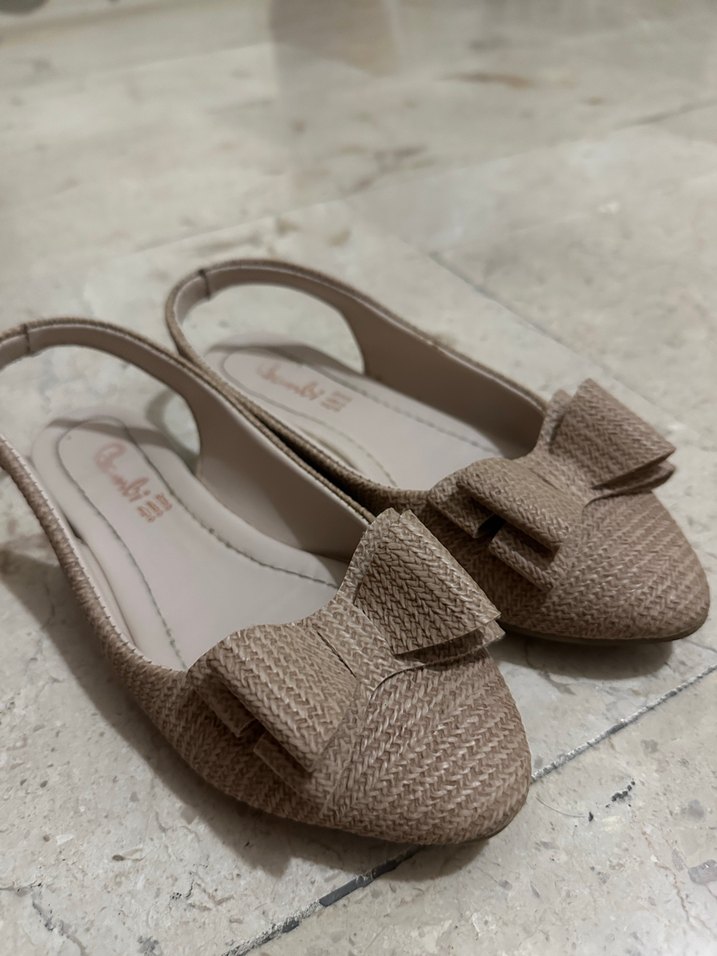 Bej renkli, kadın babetler, sentetik kumaştan ve yılan derisi desenli, fiyonk detaylı, günlük kullanıma uygun.